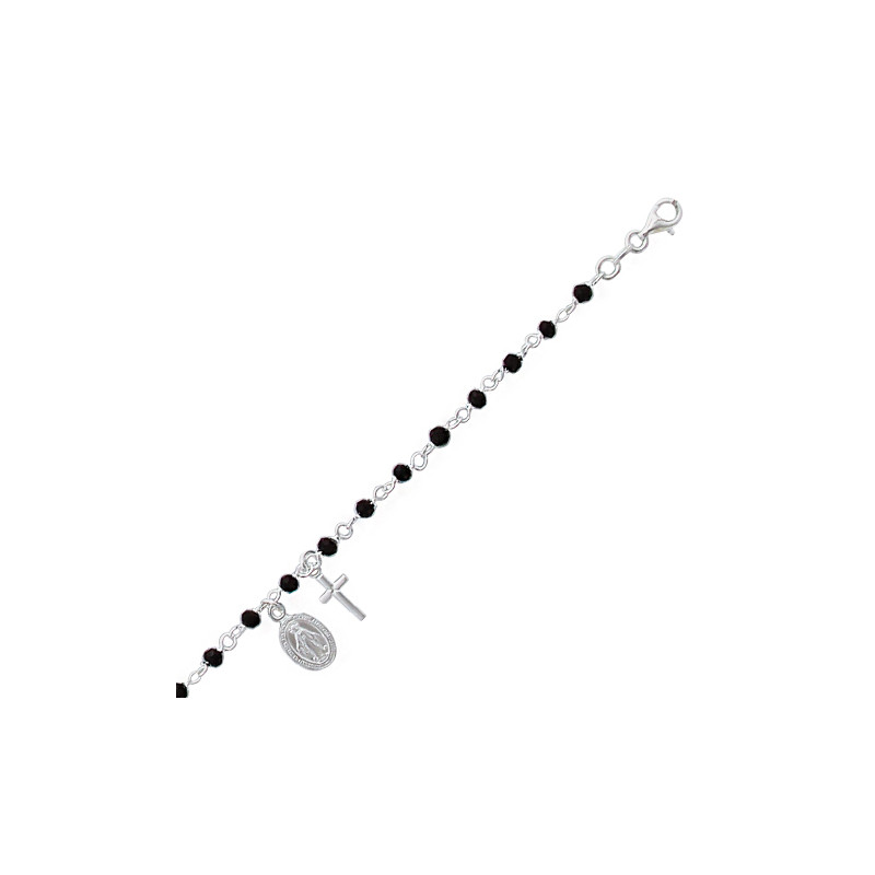 Bracelet breloque en argent, perles en cristal, motif croix et medailles miraculeuses
