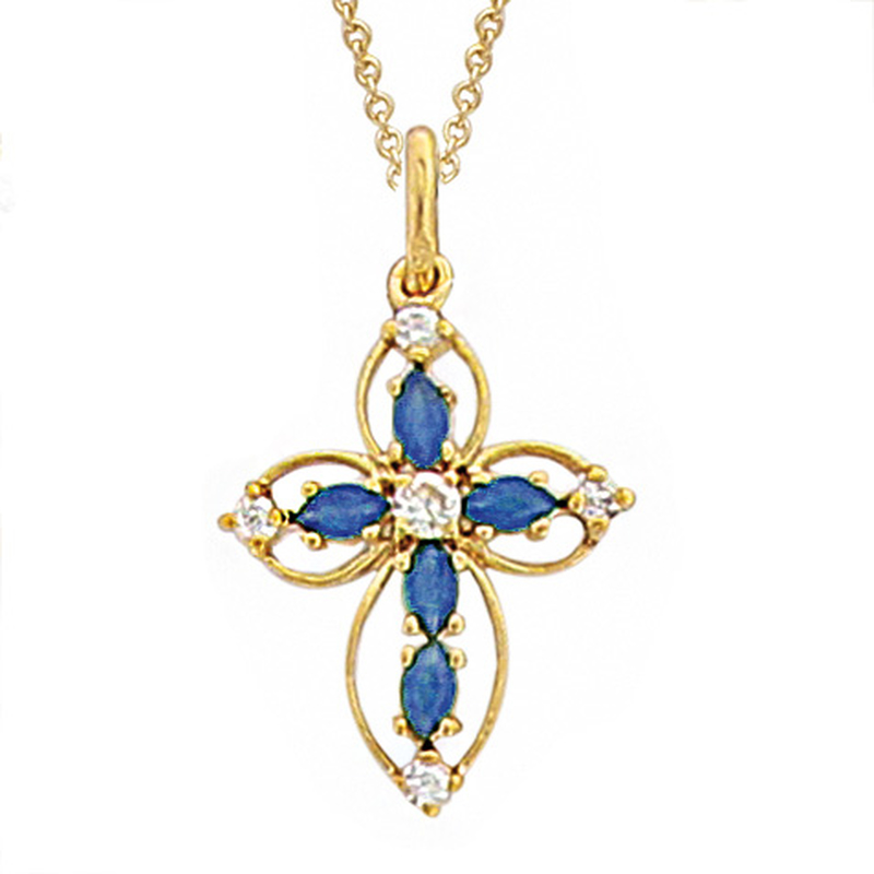 Pendentif croix plaqué or, oxyde de zirconium et saphir