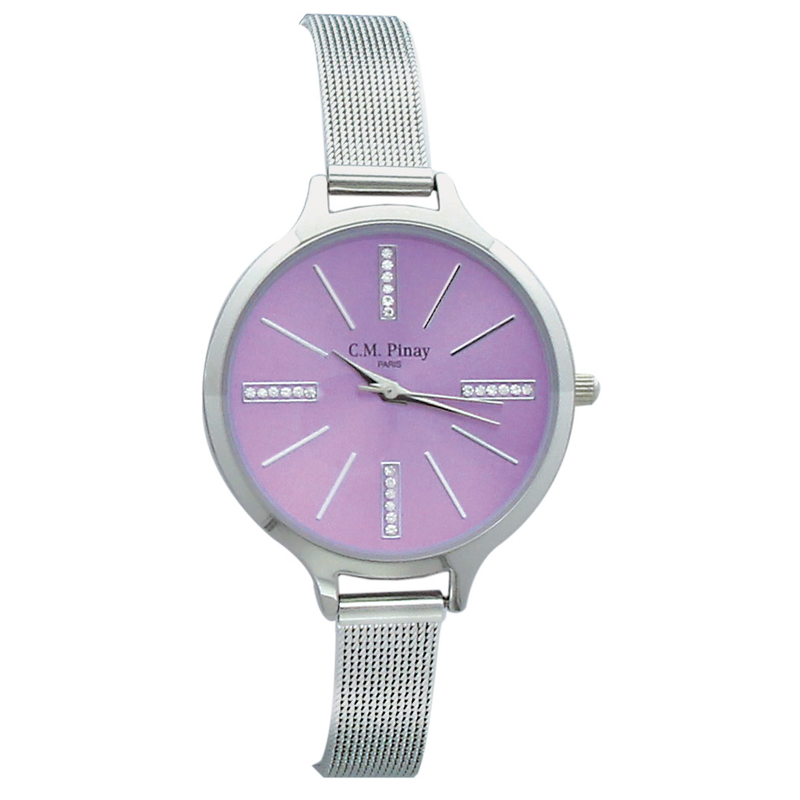 Montre CM Pinay metal couleur acier, cadran rond, ton de cadran violet, bracelet en metal, cristaux