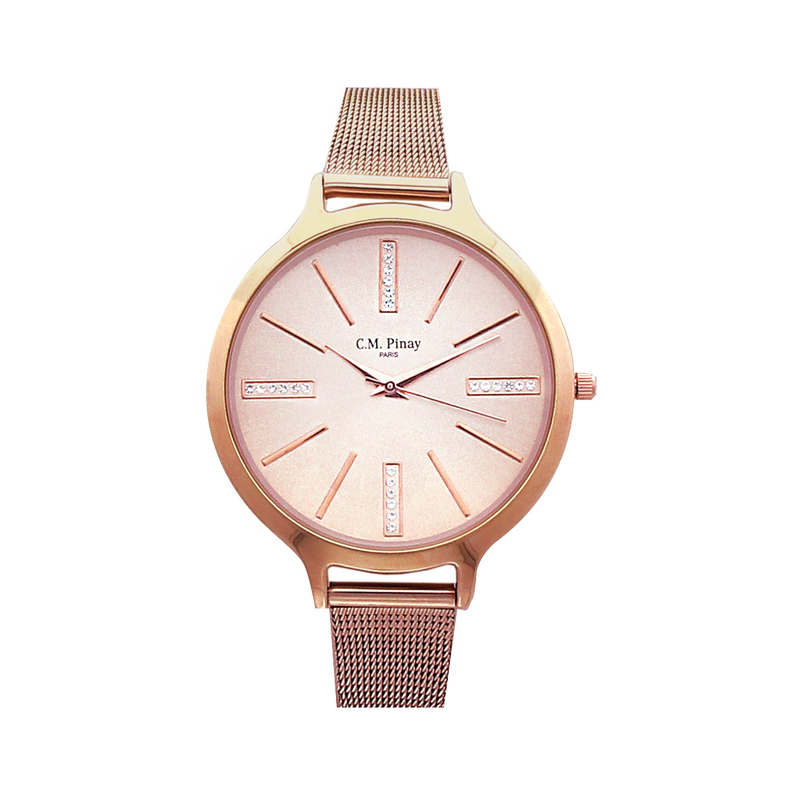 Montre CM Pinay, métal doré rose, bracelet métal et cristaux